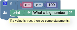 When run, this will compare the value of the variable x to 100. If it is larger, "What a big number!" will be printed. Otherwise, nothing happens.