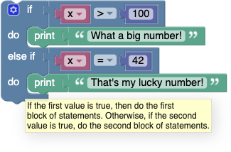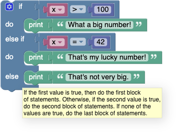 The block first checks if x > 100, printing "What a big number!" if it is. If it is not, it goes on to check if x = 42. If so, it prints "That's my lucky number." Otherwise, nothing happens.