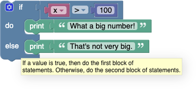 As with the previous block, "What a big number!" will be printed if x > 100; otherwise, "That's not very big." will be printed.